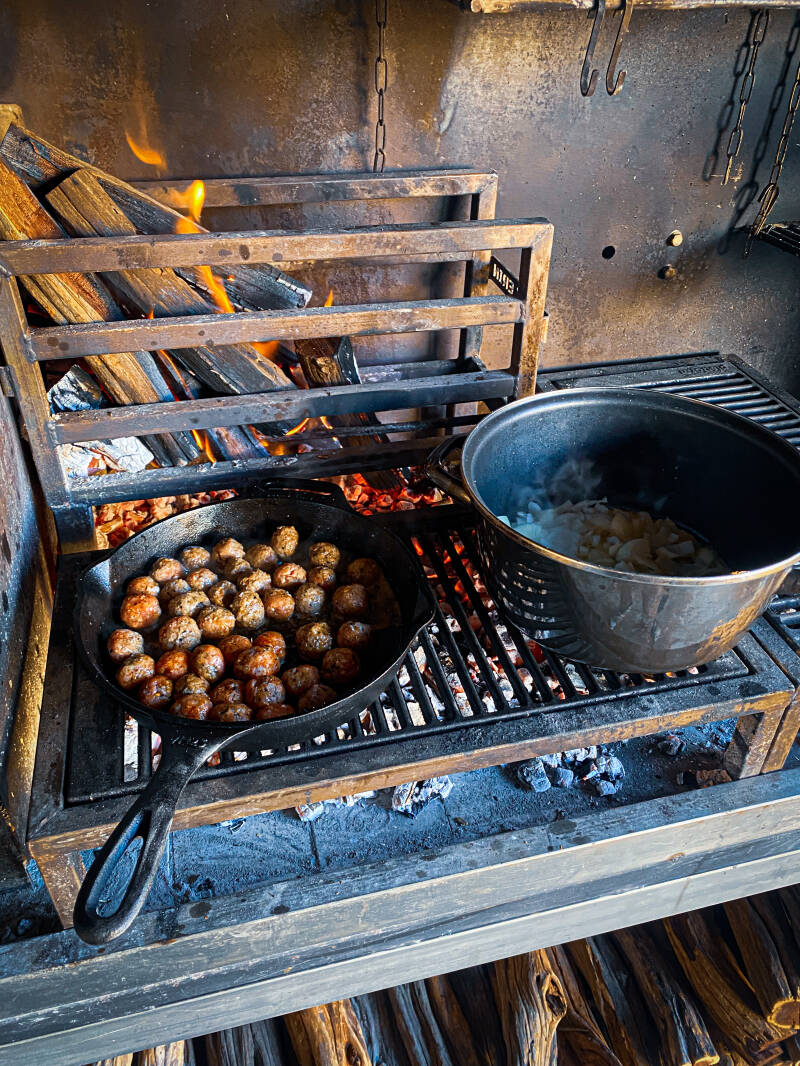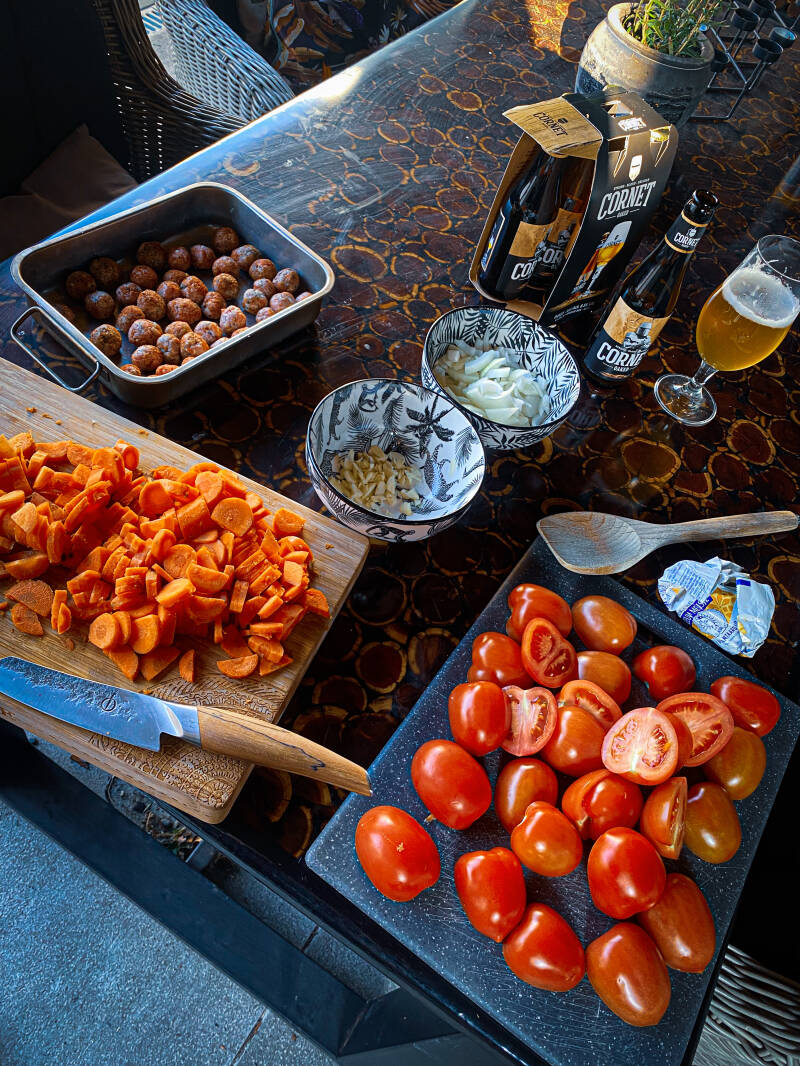 Bak in de skillet de balletjes mooi bruin en fruit in de soeppan de zoete uien en de knoflook aan. Wanneer de uien glazig zijn geworden, mogen de wortelen hierbij en laat dit samen met een eetlepel Braairub no.4 nog even mee bakken.