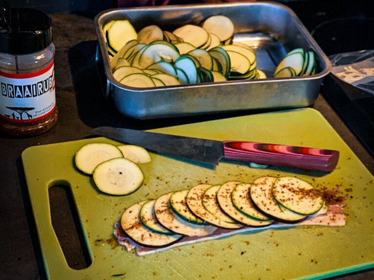 Besprenkel met wat olijfolie en bestrooi met Braairub no.2. Rol voorzichtig op en plaats het roosje in de Muffinpan.
