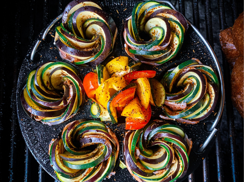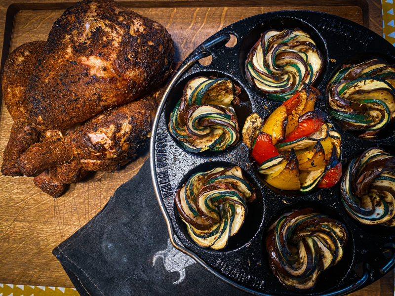 Plaats je hele kip samen met de muffinpan met roosjes op de bbq en gaar beide indirect tot je kip een kern heeft van 70-74 graden kern. Dit zal ongeveer een 45-60 minuten duren. Je ratatouille roosjes zullen in deze tijd ook gaar zijn.